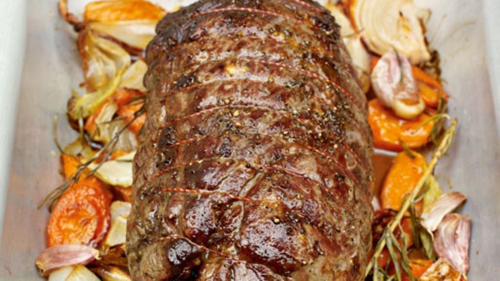 Esivalmistelut: Ota liha jääkaapista 30 minuuttia ennen kypsentämistä. Kuumenna uuni 240 asteeseen. Kasviksia ei tarvitse kuoria − riittää, kun huuhdot ja pilkot ne. Erottele valkosipulinkynnet toisistaan, älä kuori. Pane kaikki kasvikset, valkosipuli ja yrtit ison uunipellin keskelle ja valuta päälle oliiviöljyä. Voitele paisti oliiviöljyllä ja mausta se hyvin suolalla ja pippurilla hieromalla niitä lihan pintaan. Nosta paisti uunipellille kasvisten päälle.