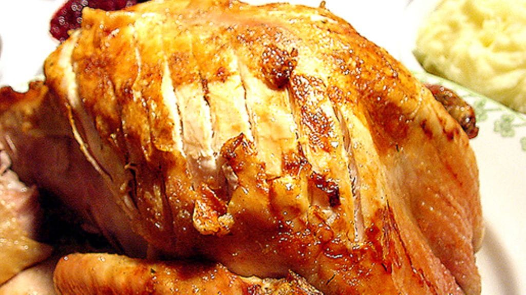 2. Kalkkuna: Hiero kalkkuna suolalla ja valkopippurilla. Täytä leipäseoksella. Laita kalkkuna ritilälle uunipannun päälle. Kaada kanaliemi pannun pohjalle. Sulata voi. Paista kalkkunaa 175-asteisessa uunissa, noin 45 minuuttia per kilo. Paista ensin selkäpuoli, sitten sivut ja lopuksi rintapuoli. Penslaa voisulalla käännösten välillä. Ota kalkkuna uunista ja kääri se folioon.