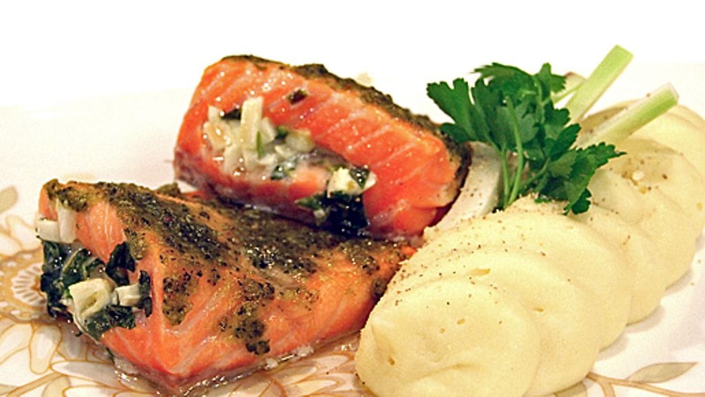 Nosta täytetyt lohipalat paistoksen päälle ja voitele pinta pestolla. Kypsennä kaloja 180 asteisessa uunissa 20 minuuttia. Tarjoa perunasoseen kera.