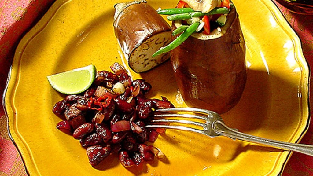 1. Kuumenna uuni 200 asteeseen. Pistele munakoisoihin pieniä reikiä veitsellä ja kääri ne alumiinifolioon. Paista uunissa n. 20 minuuttia. Ota uunista ja leikkaa hattu pois. Koverra hedelmäliha pois, mutta varo, ettet puhko kuorta.