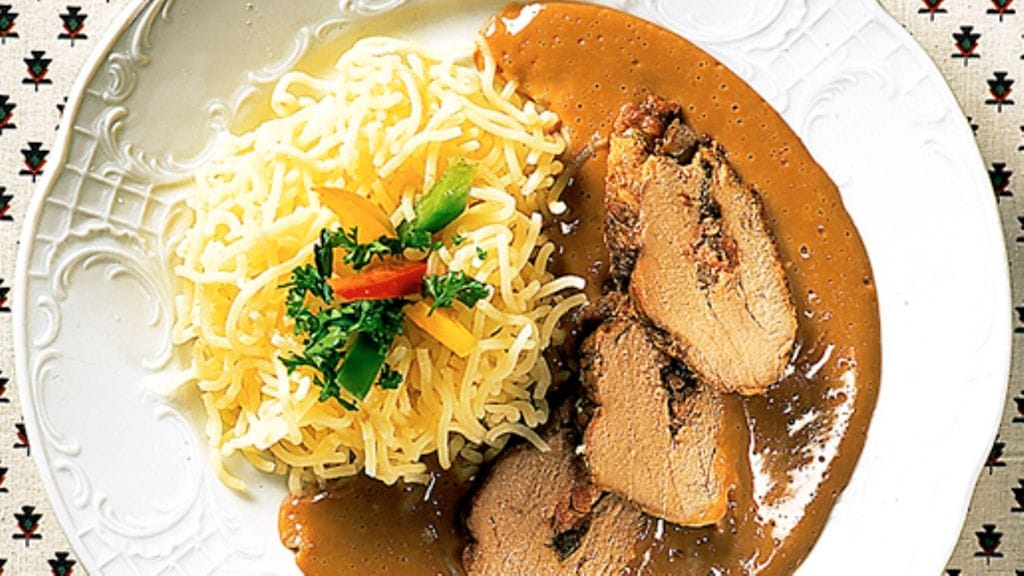1. Kuumenna uuni 175 asteeseen. Puhdista ja hienonna herkkusienet. Hienonna myös palvikinkku ja luumut. Leikkaa porsaanfileeseen pituussuuntainen viilto, avaa viilto ja täytä se luumuilla, herkkusienillä ja kinkulla. Sulje filee ja solmi ympärille puuvillalankaa. Mausta suolalla ja valkopippurilla.