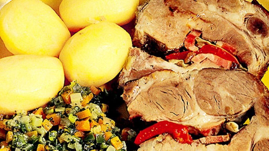 2. Kuori ja paloittele porkkanat ja selleri pieneksi. Kuori ja hienonna sipuli. Laita liharulla voideltuun, uuninkestävään vuokaan ja asettele porkkanaa, selleriä ja sipulia ympärille. Mausta suolalla ja pippurilla, kaada päälle viini.