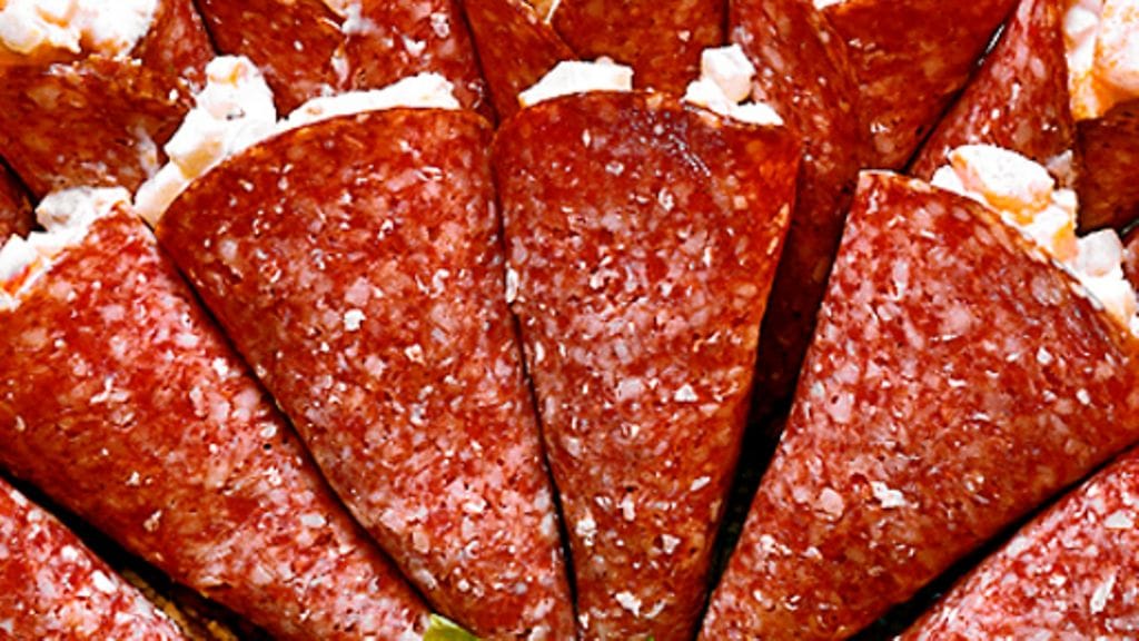 2. Laita makkaraviipaleelle nokare täytettä, taittele tuutiksi ja laita vadille, toista kaikkien salamien kanssa.