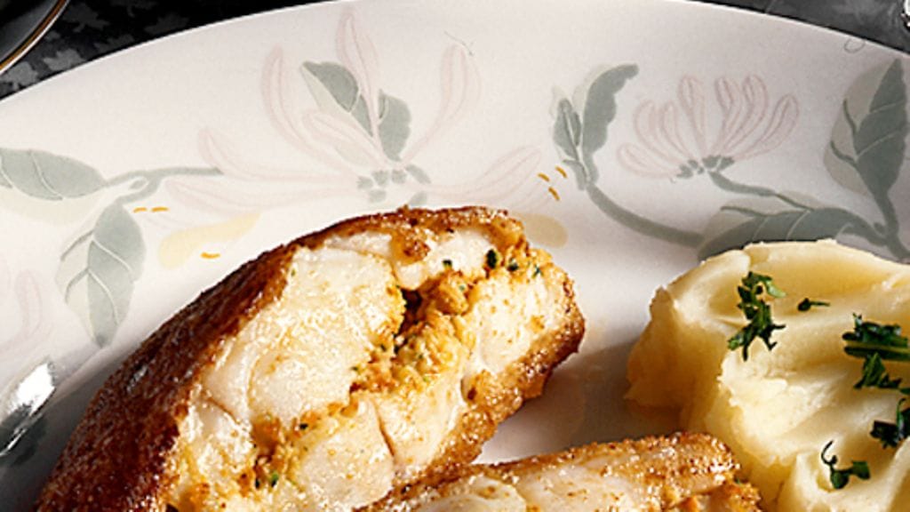 5. Paista kalat voissa miedolla lämmöllä. Tarjoile kastikkeen ja perunamuusin kera.