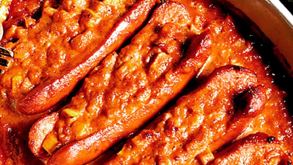 3. Sekoita chilikastike ja kerma ja kaada makkaroiden päälle. Paista uunin keskitasolla noin 20 minuuttia, kunnes makkarat ovat saaneet kauniin värin.
