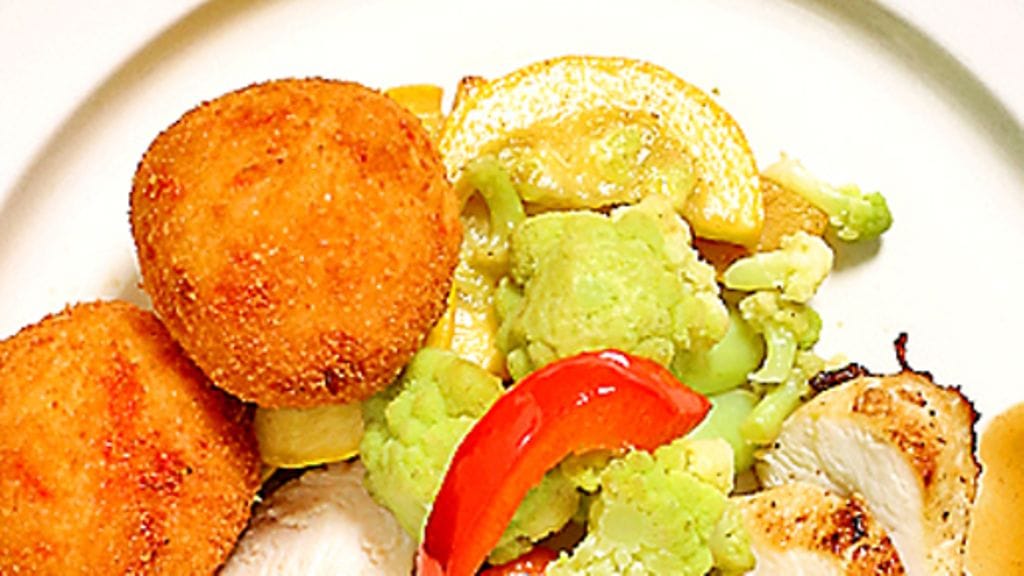 2. Riisipyörykät: Keitä riisi pakkauksen ohjeiden mukaan ja jäähdytä. Sekoita munankeltuainen riisiin. Freesaa paprikasilppua hetken aikaa voissa ja lisää riisin sekaan. Mausta suolalla ja pippurilla. Riko muna kulhoon ja vatkaa sen rakenne rikki. Pyöritä riisiseoksesta kämmenillä pieniä palleroita. Kasta ne ensin munaan, sitten vehnäjauhoon ja lopuksi korppujauhoon. Friteeraa eli uppopaista ne sitten kullanruskeiksi öljyssä. Valuta pyörykät talouspaperilla, pidä ne lämpimänä ja tarjoile täytettyjen broilerinfileiden kanssa.