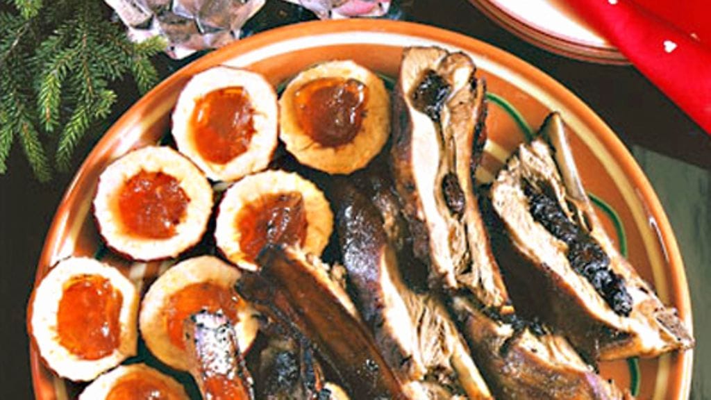 4. Halkaise omenat, poista kodat ja laita ne ritilälle paistin viereen viimeiseksi 15-20 minuutiksi paistoajasta. Täytä ne sitten hyytelöllä ja tarjoile paistin kanssa.