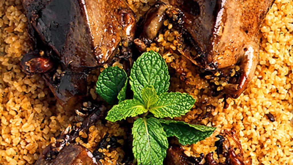 2. Kuumenna uuni 175 asteeseen. Taputtele linnut kuivaksi sisä- ja ulkopuolelta talouspaperilla. Mausta suolalla ja pippurilla. Täytä jokainen lintu 5 ruokalusikallisella bulgurseosta rintaonteloon ja 1 ruokalusikallinen kaula-aukkoon. Siirrä loppu täyte sivuun.