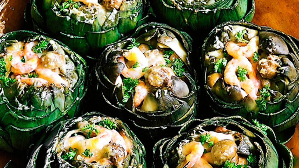 3. Ota kattila liedeltä, lisää katkaravut ja täytä artisokat seoksella. Ripottele päälle juustoraastetta ja gratinoi uunissa 5-10 minuuttia.
