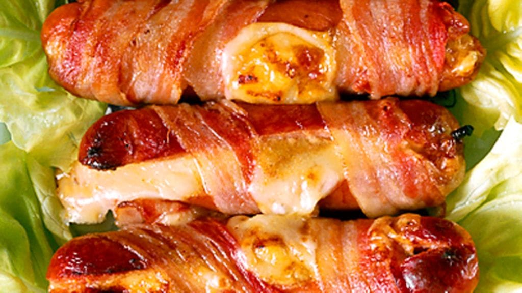 2. Kääri makkarat pekoniviipaleisiin ja laita vadille. Paista uunin keskitasolla kunnes juusto on sulanut ja pekoni kauniin väristä.