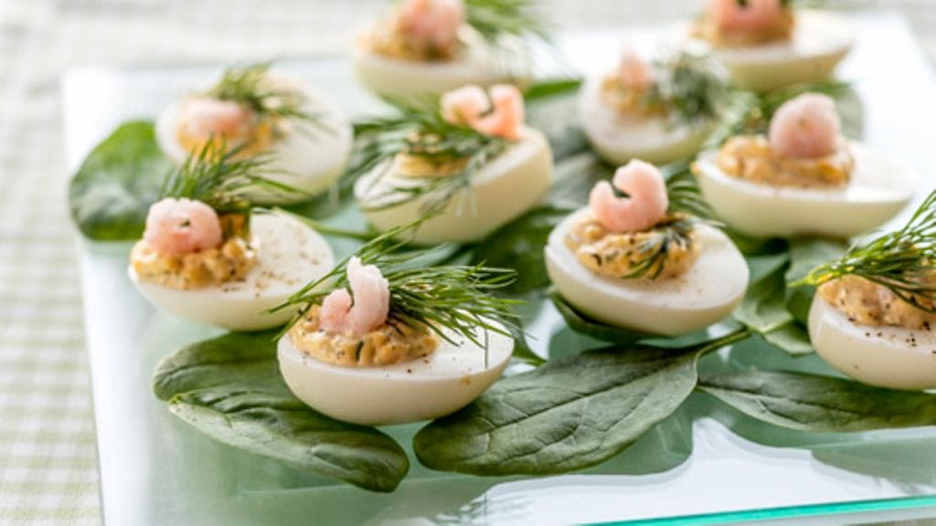 Lusikoi täyte munanpuolikkaisiin keltuaisten paikalle ja koristele katkaravuilla.