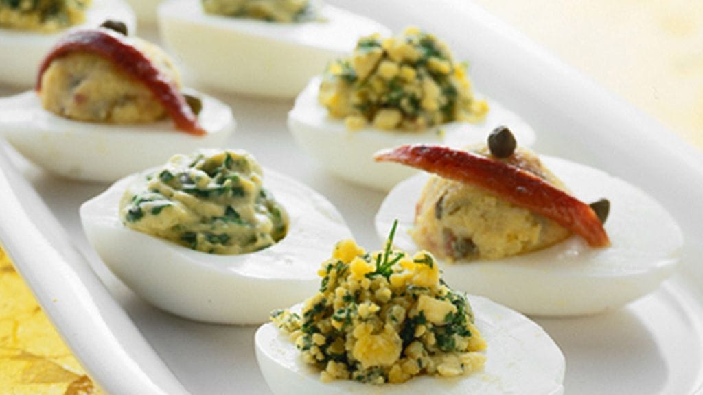 3 Valuta anjovikset. Täytä munanpuolikkaat keltuaisseoksella ja koristele anjoviksilla ja kapriksilla.