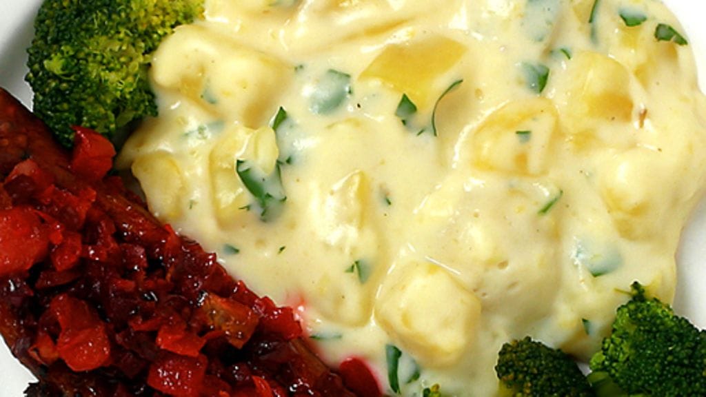 2. Viipaleperunat: Kuori ja viipaloi perunat. Keitä pehmeiksi kevyesti suolatussa vedessä ja jätä sitten valumaan. Sulata voi. Sekoita voisulaan jauhot tasaiseksi suurukseksi. Lisää maito vähän kerrallaan. Sekoita joukkoon purjoviipaleet ja hauduta pari minuuttia. Mausta suolalla ja pippurilla. Kääntele lopuksi perunaviipaleet varovaisesti maitokastikkeeseen.