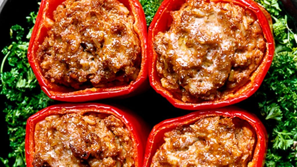 2. Kuumenna uuni 200 asteeseen. Leikkaa paprikoista hatut ja poista siemenet. Laita vähän puristettua perunaa jokaisen paprikan pohjalle, ripauta hiven muskottia päälle ja nokare voita. Täytä paprikat jauhelihaseoksella ja ripota päälle juustoraaste. Paista uunissa 35-40 minuuttia.