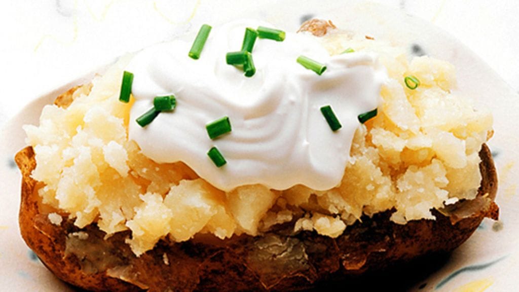2. Kuori ja hienonna sipuli ja valkosipuli. Sekoita ne ranskankerman kanssa, lisää juustoraaste, oregano ja mausta suolalla ja pippurilla. Ota perunat uunista, halkaise ne pituussuunnassa. Koverra varovaisesti sisus ilman että kuoret menevät rikki. Sekoita peruna ranskankermaseoksen kanssa niin sileäksi kuin mahdollista.