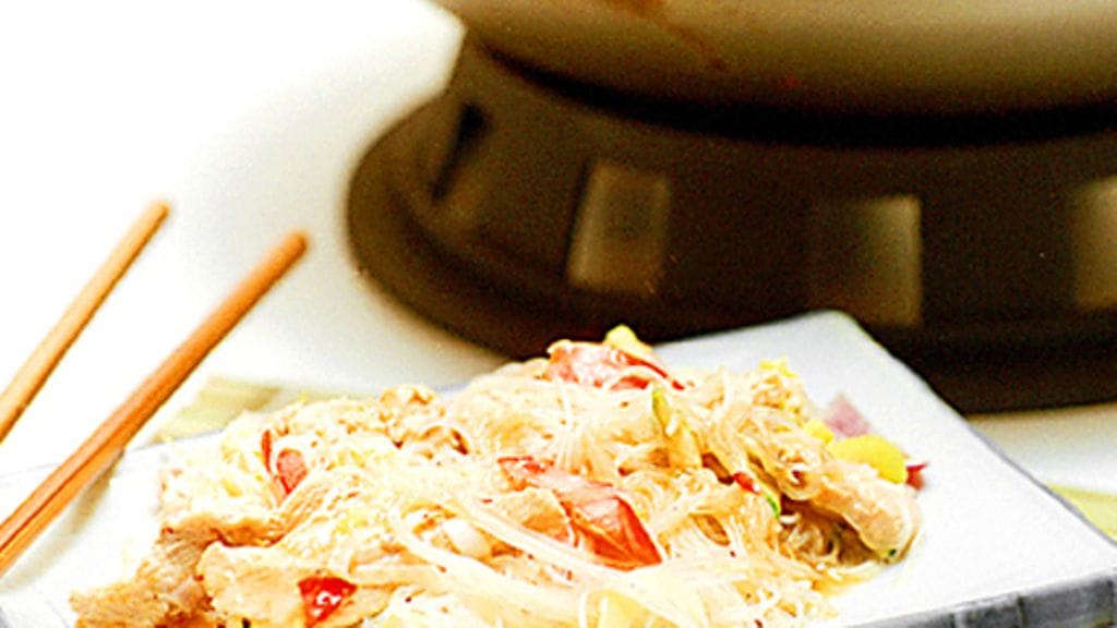 2. Pane lasinuudelit likoamaan veteen. Puhdista ja suikaloi purjo. Kuori ja suikaloi porkkana ja punasipuli. Poista sokeriherneistä kovat kannat. Suikaloi paprika ja kesäkurpitsa. Kuumenna wokkipannu ja paista broilerinsuikaleet nopeasti öljyssä. Kääntele joukkoon suikaloidut vihannekset. Valuta nuudelit lävikössä.