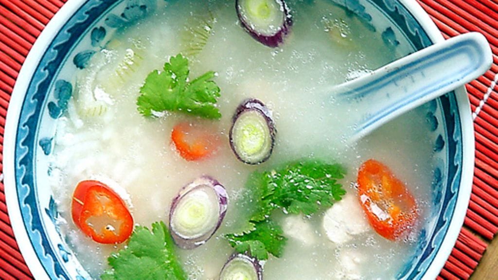1. Huuhdo riisi tarkoin monessa vedessä. Keitä veden kera n. 15 minuuttia. Kuori ja hienonna valkosipuli ja inkivääri. Kuumenna öljy isossa kattilassa, johon koko keitto mahtuu. Paista valkosipuli ja inkivääri.