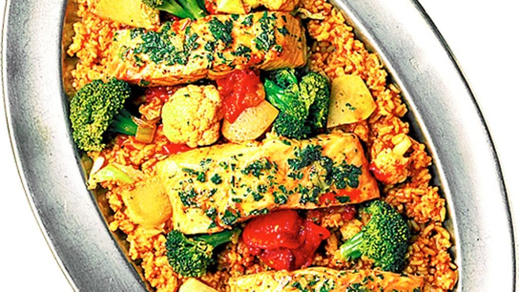 Kaada päälle vesi, suola, tomaatit ja tomaattipyree. Keitä kannen alla 4 minuuttia. Nosta kasvikset padasta ja laita ne uuninkestävään vuokaan, asettele lohipalat vierelle. Peitä foliolla ja laita uuniin.