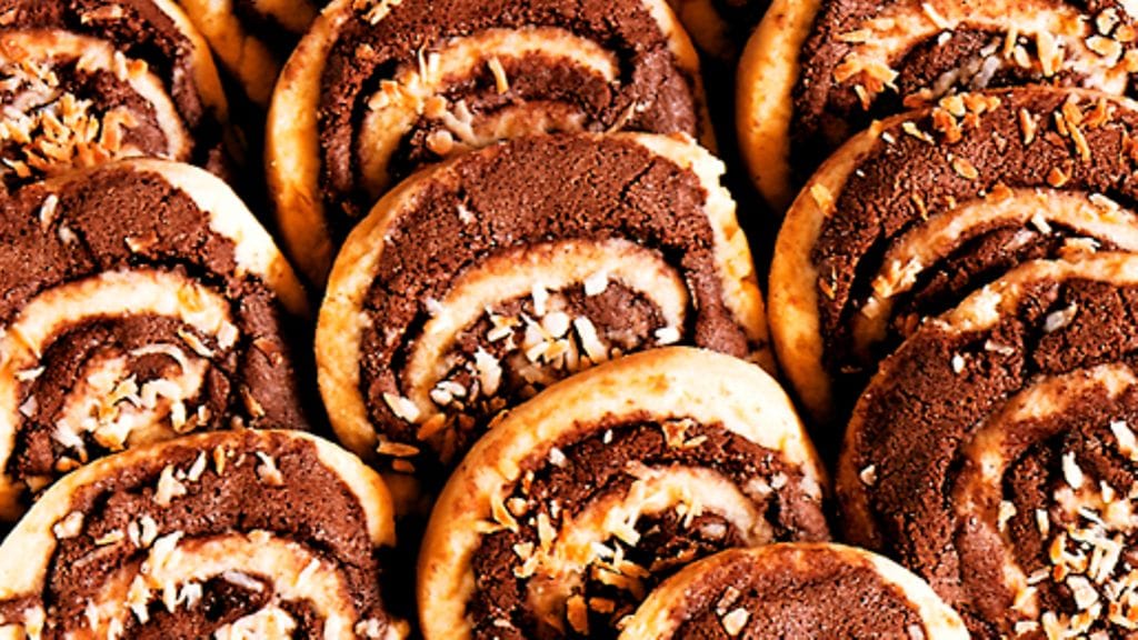 3. Levitä täyte taikinalevyille ja kääri ne kokoon kuin kääretorttu. Leikkaa ohuita pikkuleipiä ja laita ne leivinpaperille pellille. Ripottele mielellään päälle hieman kookosta ja paista 175-asteisessa uunissa 8-10 minuuttia.