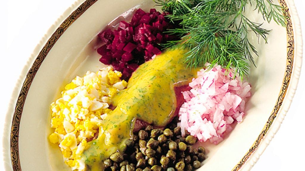 2. Silppua tilli. Vatkaa keskenään sinappi, viinietikka, hunaja ja öljy. Mausta suolalla, pippurilla ja tillillä.