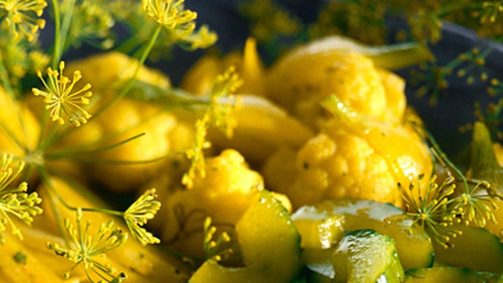 2. Kuumenna vesi ja suola kiehuvaksi. Lisää kurkuma, laakerinlehti, valkopippurit ja kruunutilli. Keitä kurkkuja muutama minuutti, kesäkurpitsaa hieman pidempään ja kukkakaalia 10 minuuttia. Poimi vihannekset kattilasta reikäkauhalla ja laita kulhoon. Kaada liemi päälle, jäähdytä ja laita kylmään tarjoiluun asti.