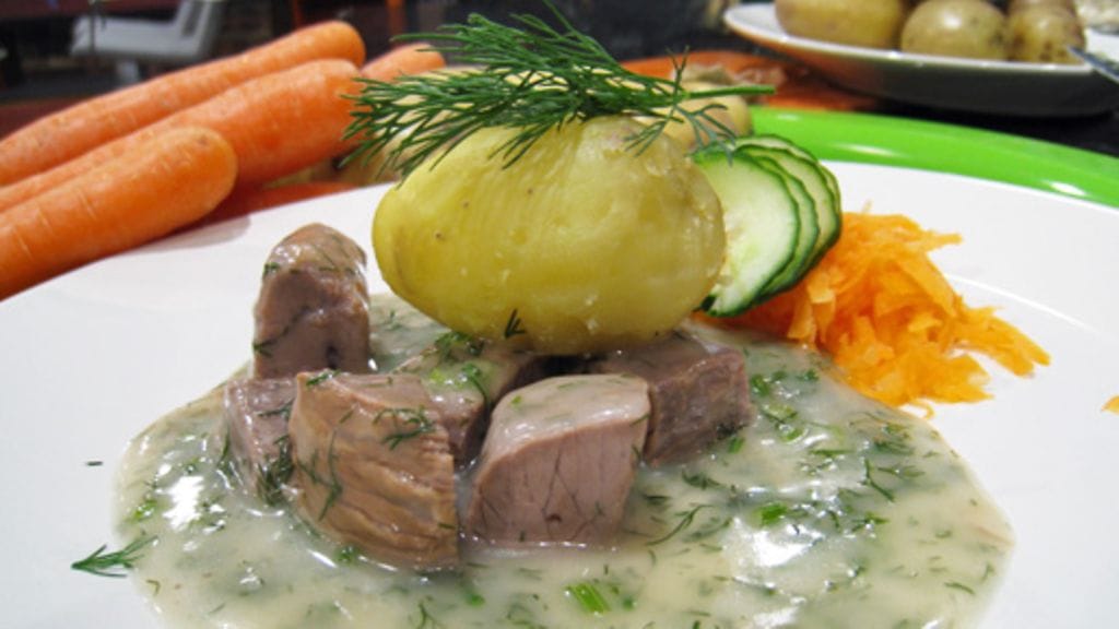 1. Kuori ja hienonna sipuli. Kuori ja kuutioi porkkana ja juuriselleri. Irrota tilli varsista ja hienonna se. Leikkaa liha tasakokoisiksi paloiksi ja nosta lihapalat ja luut kattilaan kiehuvaan veteen. Lisää sipuli, porkkana, selleri, laakerinlehti, tillinvarret ja timjami ja anna hautua, kunnes liha on kypsää (noin 40 minuuttia. Nosta liha kattilasta ja pidä se lämpimänä.