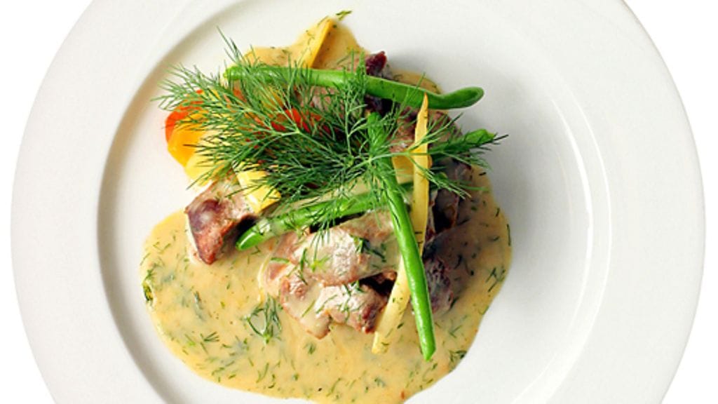 2. Nosta lihat padasta ja siivilöi liemi. Sulata voi kattilassa, ota kattila liedeltä ja vatkaa mukaan jauhot. Laita kattila takaisin liedelle, lisää lientä vähän kerrallaan samalla sekoittaen. Lisää sokeri, etikka ja loput tillinvarsista, mausta suolalla ja pippurilla. Lisää kerma ja hienonnetut tillinkukinnot.