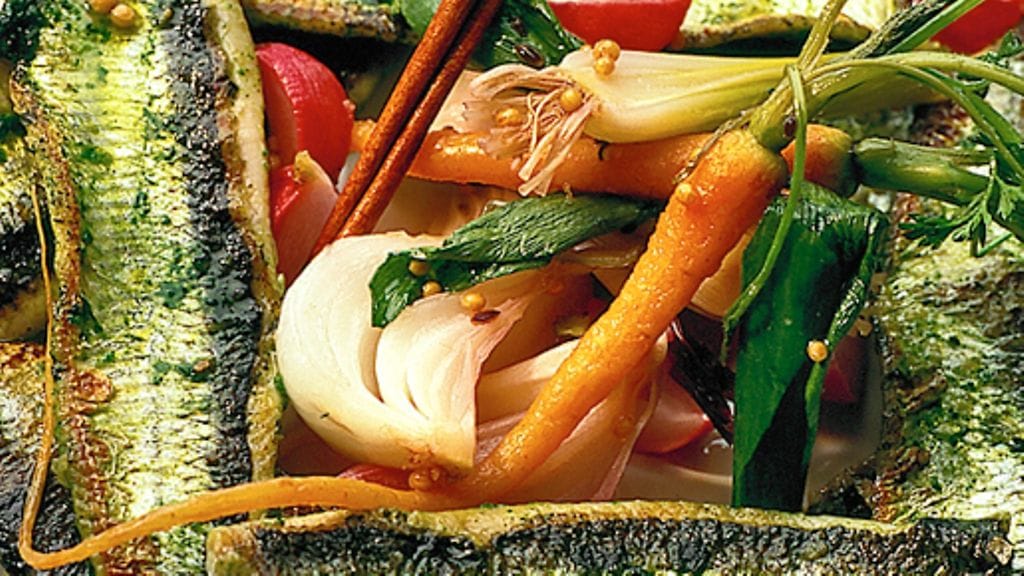 1. Fileoi kalat, mutta jätä nahat paikoilleen. Hienonna tilli. Sekoita oliiviöljy, anjovisliemi, tilli, dijoninsinappi, suola ja pippuri marinadiksi. Puserra mukaan valkosipuli. Marinoi kaloja liemessä muutama tunti jääkaapissa.
