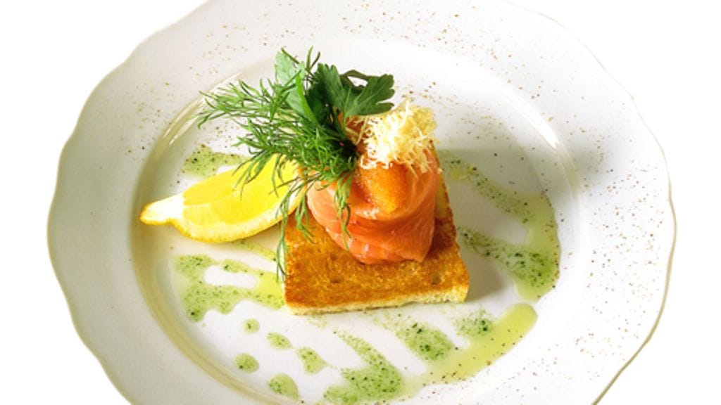 3. Leikkaa leipäviipaleista reunat pois ja paista viipaleet kullanruskeiksi voissa. Asettele neljälle lautaselle. Näin pitkälle voit valmistella ruoan etukäteen. Laita lohipaketit leiville, koristele nokareella muikunmätiä, piparjuurella, sitruunalla ja tillillä.