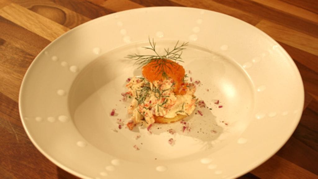 Paahda paahtoleivät paistinpannulla voissa. Nostele leivät lautasille, päälle jokirapuja ja mätilusikallinen. Koristele vielä tillinoksilla.