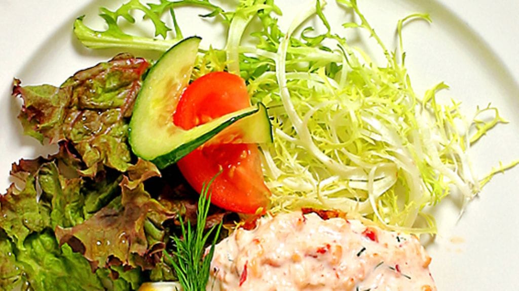 1. Hienonna tilli, säästä muutama oksa koristeluun. Sekoita kermaviili ja majoneesi. Mausta suolalla, sitruunapippurilla ja hienonnetulla tillillä. Hienonna ravunpyrstöt ja lisää seokseen.