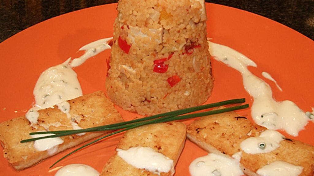 Leikkaa loput tofusta pieniksi viipaleiksi ja paista ne pannulla. Nosta viipaleita annokseen couscousin päälle.