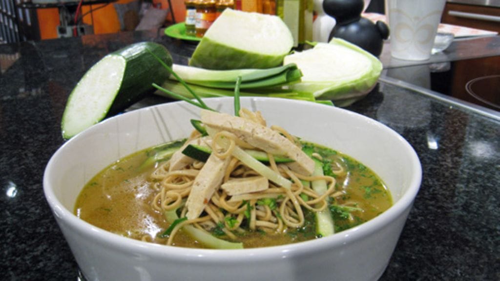 Leikkaa tofu, purjo, kesäkurpitsa ja kaali ohuiksi suikaleiksi ja viipaloi valkosipulinkynnet. Kuullota valkosipuliviipaleita kattilan pohjalla ja kaada päälle pari litraa kasvislientä. Mausta liemi hunajalla ja chilillä.