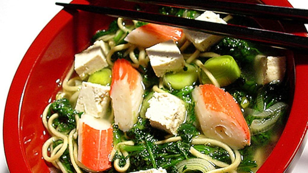 3. Kuutioi tofu. Kaada nuudelit, rapupuikot ja tofu keittoon. Kuumenna kiehuvaksi. Tarjoile leivän kera.