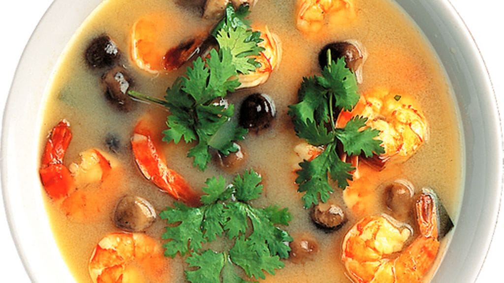 2. Harjaa ja puhdista herkkusienet. Halkaise suurimmat. Huuhtele limetinlehdet ja leikkaa ne neljään osaan. Kuori ja leikkaa sitruunaruohon varret 3 cm paloiksi. Murskaa palat veitsen lappeella. Kuori galangajuuri ja leikkaa se ohuiksi viipaleiksi. Poista chileistä siemenet, huuhtele ja leikkaa ohuiksi renkaiksi. Mittaa limettimehu ja kalakastike pieneen kulhoon ja sekoita joukkoon chilit.