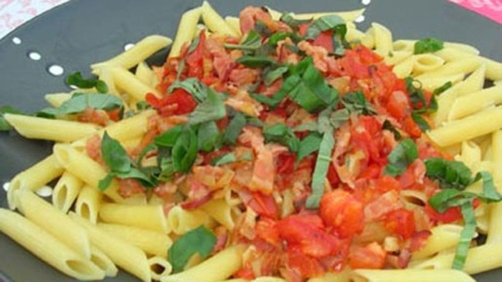 Laita pastan keitinvesi lämpenemään, muista suola. Leikkaa pekoni suikaleiksi ja paista pannulla miedolla lämmöllä. Hienonna sillä välin valkosipulikynnet ja salottisipulit. Kun pekoni on saanut hieman väriä, lisää sipulit ja paista pehmeiksi edelleen miedolla lämmöllä. Leikkaa tomaatit pieniksi paloiksi. Kaada viini pannuun ja kiehauta. Lisää joukkoon tomaattipalat, mausta suolalla ja mustapippurilla. Käännä liesi pienelle teholle. Tässä vaiheessa pastaveden pitäisi kiehua.