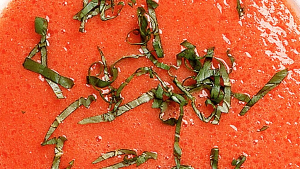 3. Kaada kuuma keitto lämpimille lautasille, sirottele pinnalle suikaloidut basilikanlehdet ja tarjoile heti.