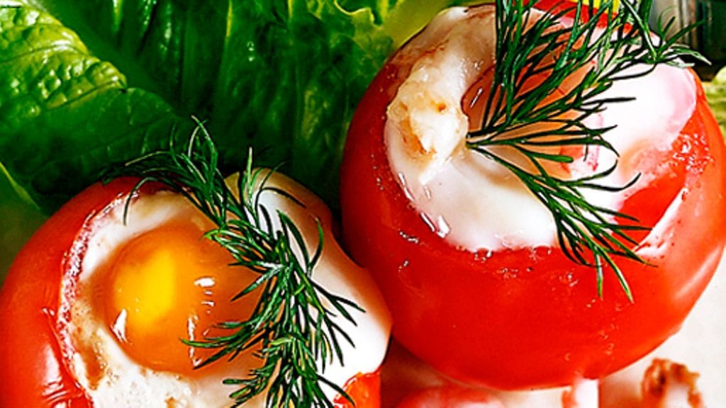 2. Riko muna molempiin tomaatteihin ja laita ne vadilla uuniin kunnes munat ovat jähmettyneet.