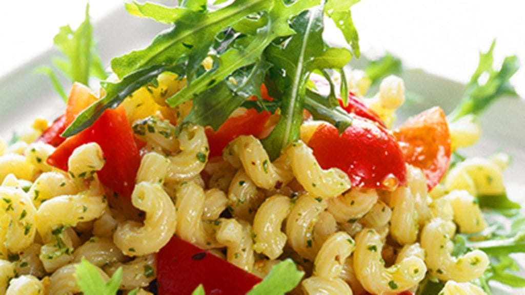 2. Sekoita öljy, viinietikka, sinappi, suola ja pippuri kastikkeeksi. Kääntele kastike makaroni-tomaattiseokseen persiljan kera.