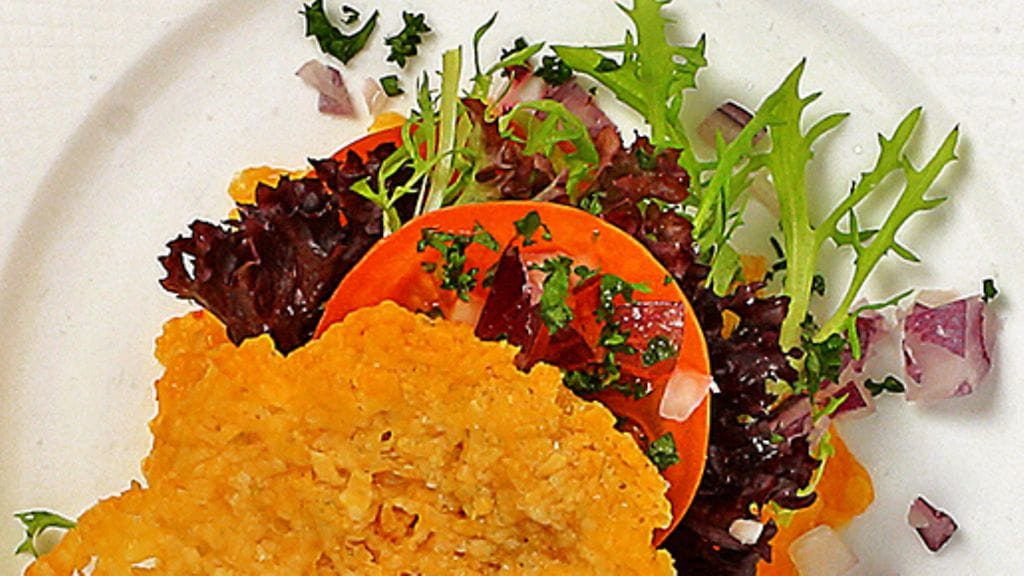 1. Parmesaanilastut: Kuumenna uuni 200 asteeseen. Piirrä leivinpaperille kahdeksan halkaisijaltaan noin 5 cm ympyrää. Raasta parmesaanijuusto ja ripottele jokaiseen ympyrään noin kaksi teelusikallista juustoa. Tasoita ja paista uunin alatasolla 4-5 minuuttia. Anna lastujen jäähtyä ennen kuin irrotat ne leivinpaperilta.