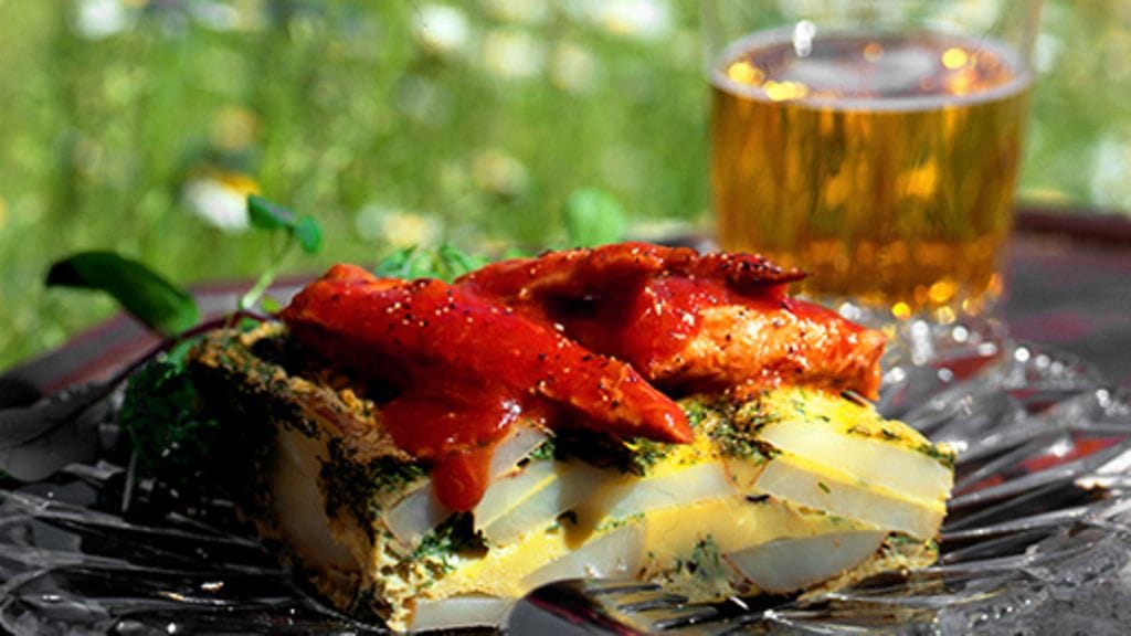 1. Kuumenna uuni 200 asteeseen. Kuori ja viipaloi perunat ohuesti, käsin tai monitoimikoneella. Viipaloi kesäkurpitsa ohuesti. Voitele neljä uuninkestävää annosvuokaa oliiviöljyllä. Hienonna yrtit.
