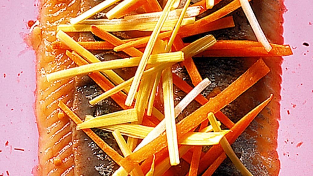 3. Ennen tarjoilua ota sillifileet liemestä ja leikkaa ne tasakokoisiksi palasiksi. Asettele palat tarjoiluvadille ja ryhmittele niiden ympärille omena- ja vihannessuikaleet. Viimeiseksi tiputellaan akvaviitti. Jos haluat etikkaliemestä vähän kauniimman väristä, voit värjätä sen tilkalla punajuurilientä.