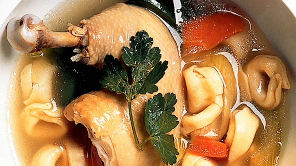 3. Poista broilerinpalat liemestä. Lisää tortellinit ja anna kiehua 15 minuuttia. Irrota broilerinpaloista luut ja pane lihat takaisin pataan pastan seuraksi. Tarkista maku. Tarjoa isoilta syviltä lautasilta.