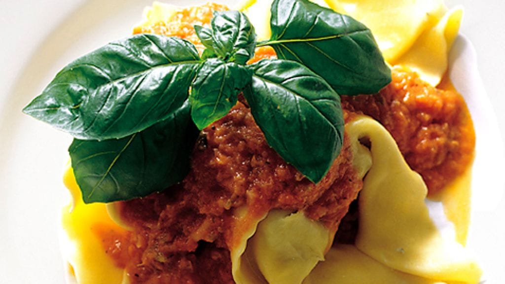 3. Kumoa tortellinit tarjoiluvadille ja kaada päälle tomaattikastike. Pyöräytä maustemyllyllä kastikkeen pinnalle muutama kerros mustapippuria.