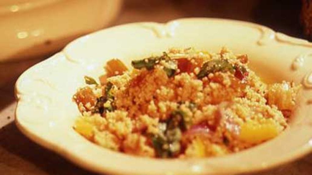 - Sekoita oliiviöljy, sitruunamehu ja soseutetut purkkitomaatit isossa kulhossa. Lisää kuskus ja sekoita hyvin.