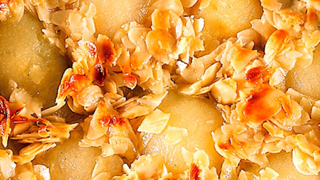 1. Kuumenna uuni 225 asteeseen. Aseta valutetut päärynät uunivuokaan.