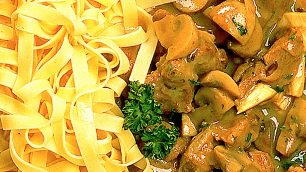 1. Leikkaa liha kahden sentin kuutioiksi. Kuori ja hienonna sipuli. Puhdista ja viipaloi herkkusienet. Sulata voi padassa keskilämmöllä. Lisää sipuli ja paista pehmeäksi muutama minuutti ilman että se ruskistuu. Lisää sienet ja paista vielä muutama minuutti.