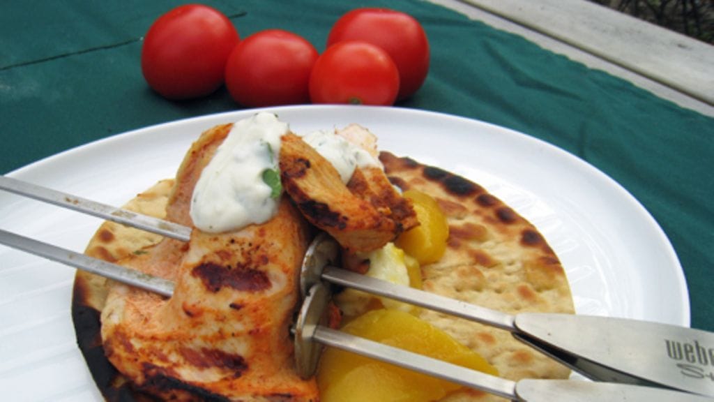Grillaa vartaat kypsiksi ja nosta kuumaan jogurttiin.
