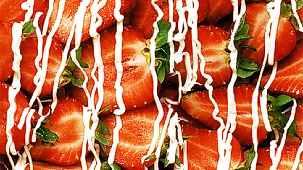 2. Reunusta lautaset mansikkakastikkeella ja asettele viipaloidut mansikat keskelle. Sekoita kerma ranskankermaan pienissä erissä ja pursota annosten päälle juuri ennen tarjoilua.