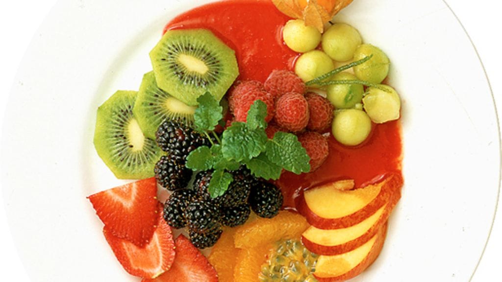 3. Tee vadelmakastikkeesta peili lautasille. Asettele hedelmät kauniisti peilin ympärille. Koristele mintulla tai sitruunamelissalla.